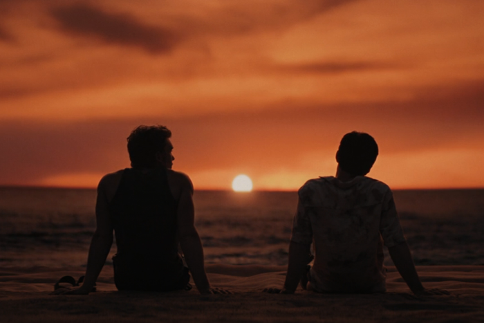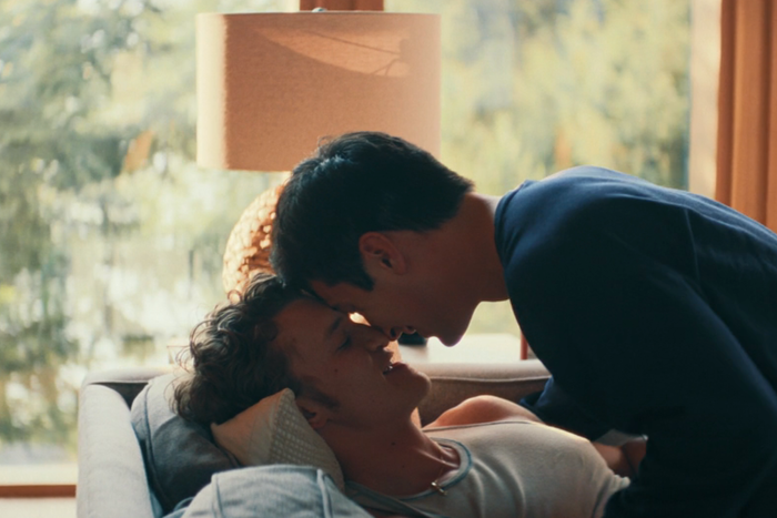Onscreen, late-afternoon light flickers across Shane and Ilya’s faces, as if filtering through trees along the road. To create the effect, Parrell worked with head lighting technician Loreen Ruddock and lighting-board operator Claire Wall, programming the “sun” to respond to a strip of pixels marking where the trees would pass, flashing on and off in real time as the car moved. “If the sun is too perfect, then you know it’s fake,” he says. Parrell wanted it to look real — the exact golden hour when Shane and Ilya would be driving home. “I just wanted it to feel aspirational,” Parrell says. “This is the queer story where there’s no gotcha moment. This is the shot where we hit that home run. This is a happy love story, and it can be yours.”