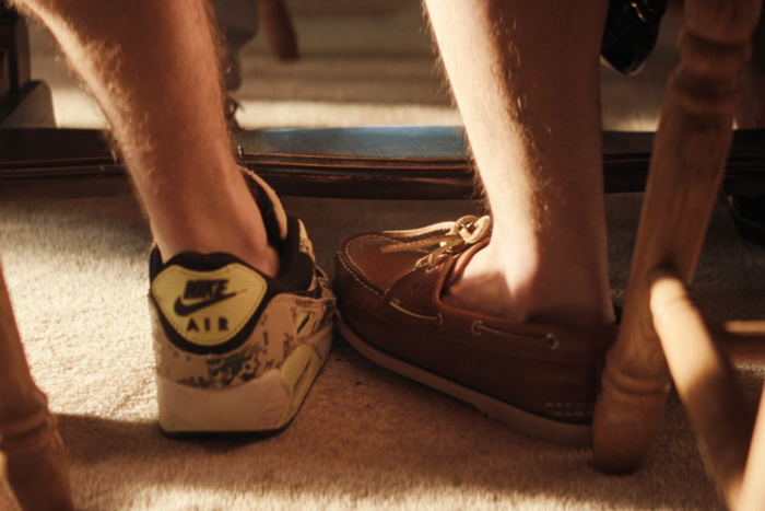 During a joint press conference in the premiere — shot with bright, flashing lights to suggest a crowd just out of frame — a reporter asks Ilya a question he doesn’t understand. Shane nudges Ilya’s foot to signal he can step in; Ilya nudges him back in thanks. The gesture needed to feel covert, so Parrell broke it off as a dedicated shot. That gesture returns in “The Cottage,” when Shane and Ilya sit opposite Shane’s parents at their kitchen table after coming out. Parrell pulled up the original frame from “Rookies,” trying to match it. “I knew there would be memes,” he says — “or I hoped there would be.” The first image is dark and cool; the second is soft and sunlit. The contrast was intuitive. In the pilot, Shane and Ilya are still near strangers. “But that second scene — that’s the point of the show,” Parrell says. “They get a happy ending. Of course the light should be warm.”