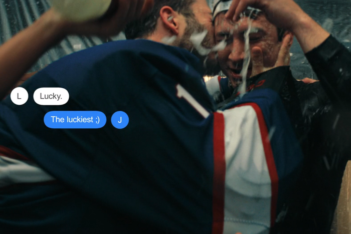 To protect the gear, Arthur Moukhortov, the show’s on-set dresser, wrapped the cameras, operators, and the locker room inside the Sleeman Centre, a Guelph arena where the series shot all its hockey scenes, in plastic. They shot the scene in slow motion, with Moukhortov playing Soren Miitka, the bearded player who kisses Shane on the cheek. Afterward, Moukhortov stayed behind to clean up, sweeping puddles of “Champagne” from the floor. “Can you imagine covering an entire room in Welch’s sparkling grape juice?” Parrell says. “It smelled insane for days.”